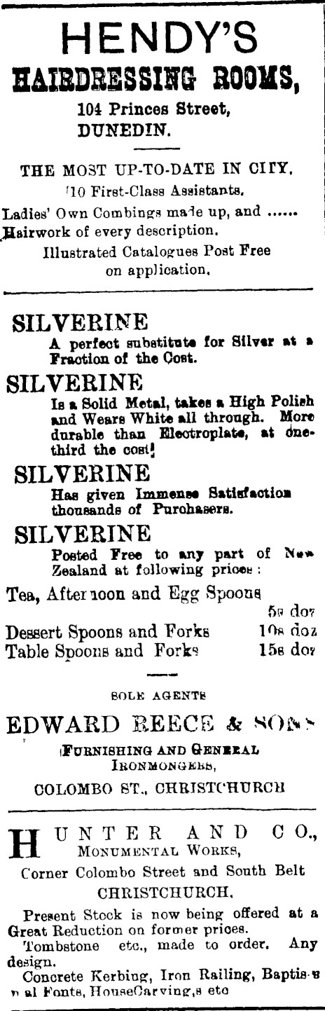 HENDY'S HAIEDRE3SIIG BOOHS, 104 Princes Street, DUNEDIN. THE MO3T UP-TO-DATE IN CITY. F lO First-Class Assistants. Ladies' Own Combings maie up, and jHairwork of every description. Illustrated Catalogues Post Free on application, SILVEEINE A perfect substitute for Silver at » Fraotion of the Cost. SILVERINE Is a Solid Metal, takes a High Polish and Wears White all through. More durable than Electroplate, at onethird the cost' SILVERINE Has given Immense Satisfaction thousands of Purchasers. SILVERINE Posted Free to any part of N»* Zealand at following prioeu : Tea, After ioon and Egg Spoons ftp do? Dessert Spoons and Porks 10* doz Table Spoons and Fork"? 15b do* BOLK AGENTB EDWARD REECE & KOfr.!* iFURNISHING AND GBNIKAL Ikonmonukhb, COLOMBO BT., CHRISTCHURCU HUNTER AND CO., Monumental Woeks, Corner Colombo Street and South Belt CHRISTCHURCH, Present Stock is now being offered at a Great Reduction on former prices. Tombstone etc., made to order. Any design. Concrete Kerbing, Iron Railing, Baptia « n al Fonts, HoufleOarving.B eto