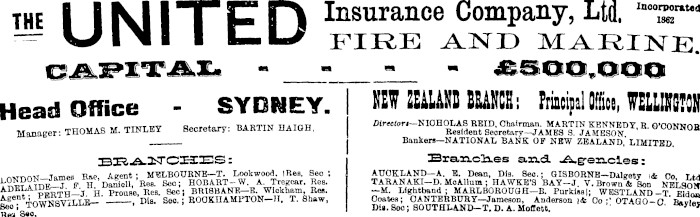 the IIM I T PPI Insurance Company, Ltd, T2T~ -^ Ulll I tU FIRE AND MARINE. OAFITAL - - - £500,000 Head Office - SYDNEY. NEW ZE4LANB B&ANCB: Principal Office, WELLIITBTON , mraT -rr a~ .^~-r, nAKTTHTiiinTi Director*— NlCHOLAS REID, Chairman. MARTIN KENNEDY B O'COVWnn Manager: THOMAS M. TINLEY Secretary: BARTIN HAIGH, Resident Secretary-JAMES S. JAMESON OON «OB Bankers—NATIONAL BANK OF NEW ZEALAND," LIMITBD. BBA-ITCKES: BrarLc3a.es axs.d. -A.g'eaa.cles : . Tames Rae Aeent; MELBOURNE— T. Lookwood. IReg. Sec*. AUCKLAND— A. E. Dean, Dia. Sec; GISBORNB— DaIgety i& Co Ltd VsE???fS '^? IF H DaSSI, Res. Sec; HOBART-W. A. Tregoar. Res. TARANAKI-D. MoAllum ; HAWKE'S BAY-J. V. Brown* Bon NELSOIf ADELAIDB-J. h^^» ■ g^ BRIBBA . NB -B. Wiokhatn, Res. -M. Llghtband ; MARLBOROUSH-B. Purktaa|; WESTLAND -TEldtm Age 4-nwNSVILLB-^' -— -, I>ia. Seo. ROOKHAMPTON-H. T. Shaw, Ooatea; OANTERBURY-Jameson, Anderson |* Oo ;' OTAQO-0 B»vl« Sco; luwasvi^ua- Di». Seo; SOUTHLAND— T.D. A. Moflett. ' ""/ioj Hea 3«o.