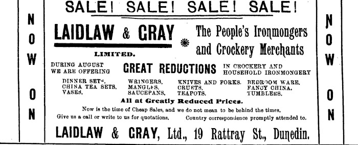 SALE! SALE! SALE! SALE! || ===== v 0 LAIDLAW & CRAY „ The People's Ironmongers J w UMITED . and Crockery Merchants « DURING AUGUST ORCAT DCnilPTinilO IN OKOOKERY AND " WB ARE OFFERING UIILIII IttUUUIIUIIO HOUSEHOLD IRONMONGERY DINNER SET". WRINGERS. KNIVES AND FORKS. BEDROOM WARE. 0 CHIN A TEA SETS. MANGLbS. CRUETB. FANCY CHINA. VASES. SAUCEPANS. TEAPOTS. TUMBLEKS. 11 All at Greatly Reduced Prices. ** NNow is the time of Cheap Sales, and we do not mean to be behind the times. |i Give ns a oall or write to us for quotations. Country correspondence promptly attended to. N LAIDLAW & CRAY, Ltd, 19 Rattray St., Dunedin,