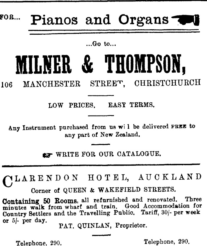 FOR Pianos and Organs ...Go t0... MILKER & THOMPSON, 106 MANCHESTER STREET OHRISTCHURCH LOW PRICES. EASY TERMS. Any Instrument purchased from us wi 1 be delivered pbkb to any part of New Zealand. IS- WRITE FOR OUR CATALOGUE. (CLARENDON HOTEL, AUCKLAND Corner of QUEEN & WAKEFIELD STREETS. Containing 50 Booms, all refurnished and renovated. Three minutes walk from wharf and train. Good Accommodation for Country Settlers and the Travelling Public. Tariff, 30/- per week or 5/- per day. PAT. QUINLAN, Proprietor. Telephone, 290. Telephone, 290.