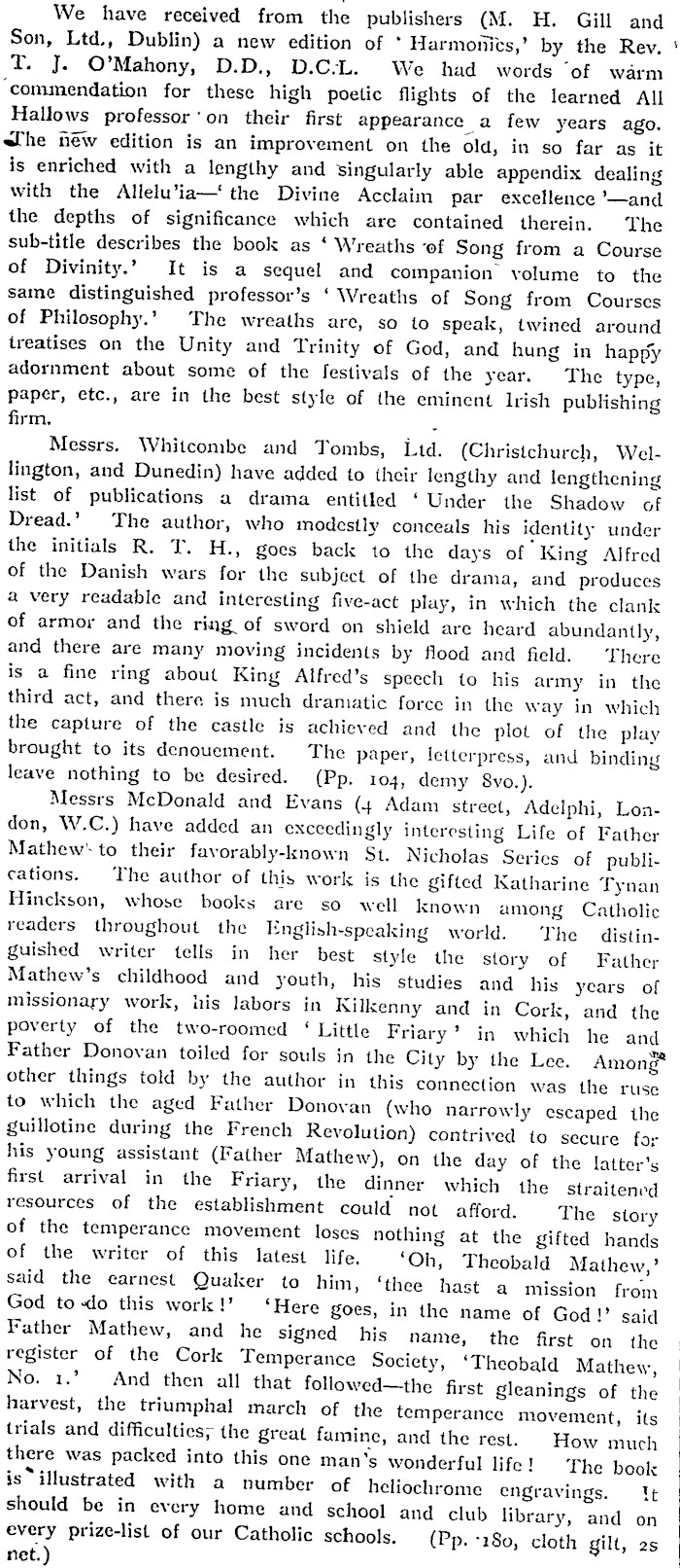 We have received from the publishers (M. H. Gill and Son, Ltd., Dublin) a new edition of ' Harmonics,' by the Rev. s T. J. O'Mahony, D.D., D.C.L. We hud words of warm commendation for these high poetic flights of the learned All Hallows professor •on their first appearance a few years ago. new edition is an improvement on the old, in so far as it is enriched with a lengthy and singularly able appendix dealing with the Alleluia— the Divine Acclaim par excellence '—and the depths of significance which are contained therein. The sub-title describes the book as ' Wreaths -of Song from a Course of Divinity.' It is a sequel and companion" volume to the same distinguished professor's ' Wreaths of Song from Courses of Philosophy.' The wreaths are, so to speak, twined around treatises on the Unity and Trinity of God, and hung in happy adornment about some of the festivals of the year. The type, paper, etc., are in the best style of the eminent Irish publishing firm. Messrs. Whitcombe and Tombs, Ltd. (Chrislchurch, Wellington, and Dunedin) have added to their lengthy and lengthening j list of publications a drama entitled ' Under the Shadow of I Dread.' The author, who modestly conceals his identity under i the initials R. T. H., goes back to the days of " King Alfred of the Danish wars for the subject of the drama, and produces a very readable and interesting five-act play, in which the clank of armor and the rui& of sword on shield are heard abundantly, and there are many moving incidents by flood and field. There is a fine ring about King Alfred's speech to his army in the third act, and there, is much dramatic force in the way in which the capture of the castle is achieved and the plot of the play brought to its denouement. The paper, letterpress, and binding leave nothing to be desired. (Pp. 104, demy Svo.). Messrs McDonald and Evans (4 Adam street, Adelphi, London, W.C.) have added an exceedingly interesting Life of Father Mathew'- to their favorably-known St. Nicholas Series of publications. The author of this work is the gifted Katharine Tynan Hinckbon, whose books are so well known among Catholic readers throughout the Knglibh-spcaking world. The distinguished writer tells in her best style the story of Father Mathew's childhood and youth, his studies and 'his years of missionary work, his labors in Kilkenny and in Cork and the poverty of the two-roomed 'Little Friary' in which he and Father Donovan toiled for souls in the City by the Lee. Among 9 other things told by the author in this connection was the ruse to winch the aged Father Donovan (who narrowly escaped the guillotine during the French Revolution) contrived to secure fohis young assistant (Father Mathew), on the day of the latter's first arrival in the Friary, the dinner which the straitened resources of the establishment could not afford. The story of the temperance movement loses nothing at the gifted hands of the writer of this latest life. 'Oh, Theobald Mathew' said the earnest Quaker to him, 'thee hast a mission from God to-do tins work!' 'Here goes, in the name of God!' said Father Mathew, and he signed his name, the first on the reg.ster of the Cork Temperance Society, 'Theobald Mathew No. 1. And then all that followed-the first gleanings of the harvest, the triumphal march of the temperance movement, its trials and difficulties;- the great famine, and the rest. How much there was packed into this one man's wonderful life! The boolw illustrated with a number of heliochrome engravings 't should be in every home and school and club library, and on every prize-list of our Catholic schools. (Pp. . 18 0, cloth gilt 2S