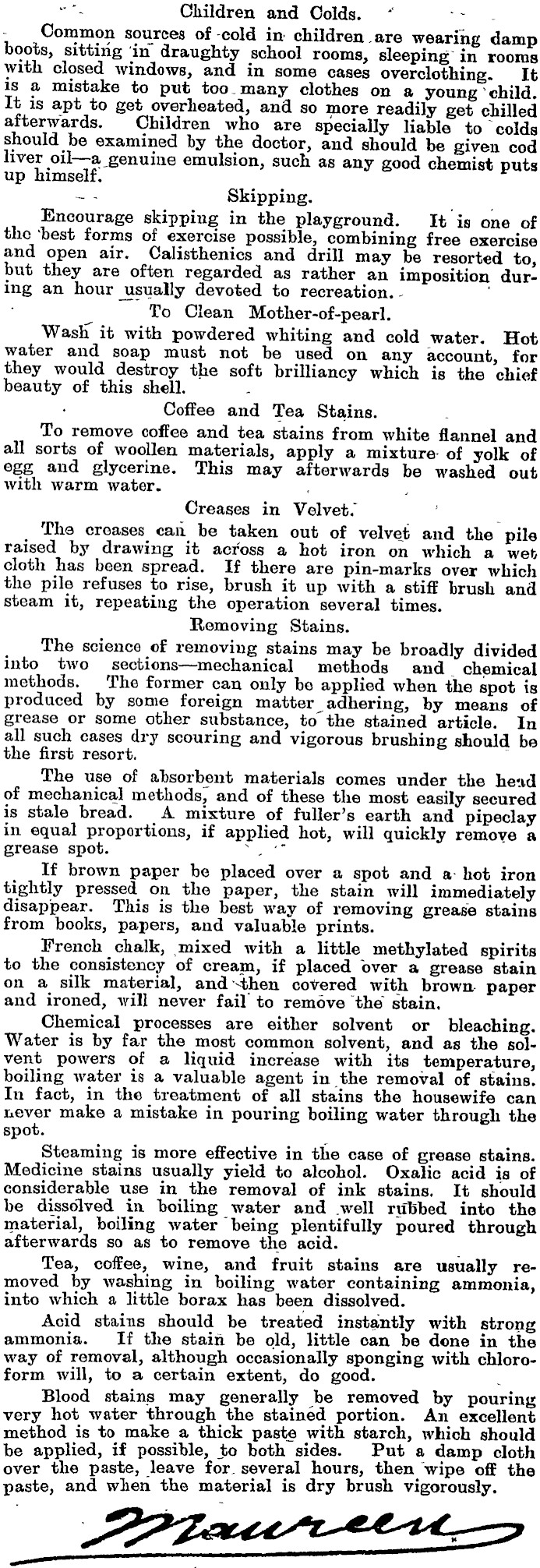 Children and Colds. " • - . Common sources of cold in children. are wearing damp boots, sitting in draughty school rooms, sleeping in rooms with closed windows, and in some cases overclothing. It is a mistake to put too _ many clothes on a young child. It is apt to get overheated, and so more readily get chilled afterwards. Children who are specially liable to colds should be examined by the doctor, and should be given cod liver oil— a genuine emulsion, such as any good chemist puts up himself. Skipping. Encourage skipping in the playground. It is one of the best forms of exercise possible, combining free exercise and open air. Calisthenics and drill may be resorted to, but they are often regarded as rather an imposition during an hour _usually devoted to recreation. - To Clean Mother-of-pearl. Wash' it with powdered whiting and cold water. Hot water and soap must not be used on any account, for they would destroy the soft brilliancy which is the chief beauty of this shell. Coffee and Tea Stains. To remove coffee and tea stains from white flannel and all sorts of woollen materials, apply a mixture of yolk of egg and glycerine. This may afterwards be washed out with warm water. Creases in Velvet." The creases caii be taken out of velvet and the pile raised by drawing it across a hot iron on which a web cloth has been spread. If there are pin-marks over which the pile refuses to rise, brush it up with a stiff brush and steam it, repeating the operation several times. Removing Stains. The science of removing stains may be broadly divided into two sections — mechanical methods and chemical methods. The former can only be applied when the spot is produced by some foreign matter adhering, by means of grease or some other substance, to" the stained article. In all such cases dry scouring and vigorous brushing should be the first resort. The use of absorbent materials comes under the head of mechanical methods, and of these the most easily secured is stale bread. A mixture of fuller's earth and pipeclay in equal proportions, if applied hot, will quickly remove a grease spot. , * If brown paper be placed over a spot and a hot iron tightly pressed on. the paper, the stain will immediately disappear. This is the best way of removing grease stains from books, papers, and valuable prints. French chalk, mixed with a little methylated spirits to the consistency of cream, if placed over a grease stain on a silk material, and -then covered with brown- paper and ironed, will never fail to remove the" stain. Chemical processes are either solvent or bleaching. Water is by far the most common solvent, and as the solvent powers of a liquid increase with its temperature, boiling water is a valuable agent in the removal of stains. In fact, in the treatment of all stains the housewife can never make a mistake in pouring boiling water through the spot. Steaming is more effective in the case of grease stains. Medicine stains usually yield to alcohol. Oxalic acid is of considerable use in the removal of ink stains. It should be dissolved in boiling water and well rubbed into the material, boiling water "being plentifully poured through afterwards so as to remove the acid. Tea, coffee, wine, and fruit stains are usually removed by washing in boiling water containing ammonia, into which a little borax has been dissolved. Acid stains should be treated instantly with strong ammonia. If the stain be old, little oan be done in the way of removal, although occasionally sponging with chloroform will, to a certain extent, do good. Blood stains may generally be removed by pouring very hot water through the stained portion. An excellent method is to make a thick paste with starch, which should be applied, if possible, jfco both sides. Put a damp cloth over the paste, leave for, several hours, then "wipe off the paste, and when the material is dry brush vigorously.