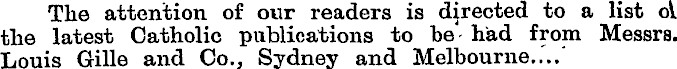 The attention of our readers is directed to a list ol the latest Catholic publications to be had from Messrs. Louis Gille and Co., Sydney and Melbourne..'..'