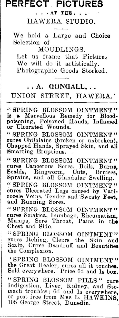 PERFECT PICTURES ... THE ... HAWERA STUDIO. We hold a Large and Choice Selection of MOUDLINGS. Let us frame that Picture* We will do it artistically. Photographic Goods Stocked. . . A. QUNQALL, . . UNION STREET, HAWERA. “ SPRING BLOSSOM OINTMENT” in a Marvellous Remedy for Bloodpoisoning, Poisoned Hands, Inflamed or Ulcerated Wounds. “ SPRING BLOSSOM OINTMENT” cures Chilblains (broken or unbroken), Chapped Hands, Sprayed Skin, and all Smarting Eruptions. „ SPRING BLOSSOM OINTMENT” cures Cancerous Sores, Boils. Burns, Scalds, Ringworm, Cuts, Bruises, Sprains, and all Glandular Swelling. “SPRING BLOSSOM OINTMENT” cures Ulcerated Legs caused by Varicocele Veins, Tender and Sweaty Feet, and Running Sores. “ SPRING BLOSSOM OINTMENT ” cures Sciatica, Lumbago, Rheumatism, Mumps, Sore Throat, Pains in ths Chest and Side. “ SPRING BLOSSOM OINTMENT ” cures Itching, Clears the Skin and Scalp, Cures Dandruff and Beautifies the Complexion. ‘SPRING BLOSSOM OINTMENT” the Great Healer, cures all it touches. Sold everywhere. Price 6d and Is box. “SPRING BLOSSOM PILLS” cure Indigestion, Liver, Kidney, and Stomach troubles; 6d and Is everywhere, or post free from Mrs L. HAWKINS, 106 George Street, Dunedin.