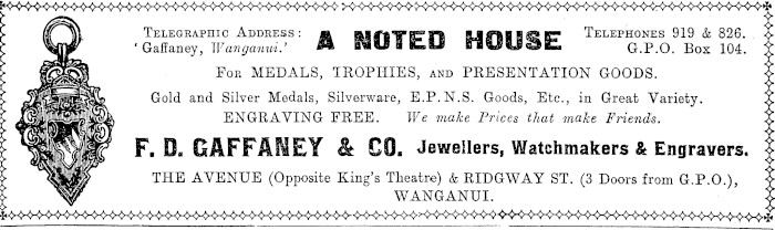 Telegraphic Address: m ilflTPri UffiSifiiS 8 Telephones 919 & 826. ‘Gaffaney, Wanganui .’ *** PiU iHU ily||®fc G.P.O. Bos 104. For MEDALS, TROPHIES, and PRESENTATION GOODS. Gold and Silver Medals, Silverware, E.P.N.S. Goods, Etc., in Great Variety. ENGRAVING FREE. We make Prices that make Friends. F. D. GAFFANEY & CO. Jewellers, Watchmakers & Engravers. THE AVENUE (Opposite King’s Theatre) & RIDGWAY ST. (3 Doors from G.P.0.), $ WANGANUI. t k
