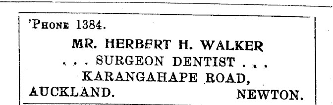 ’Phone 1384. MR. HERBERT H. WALKER , . . SURGEON DENTIST . * . KARANGAHAPE ROAD, AUCKLAND. NEWTON.
