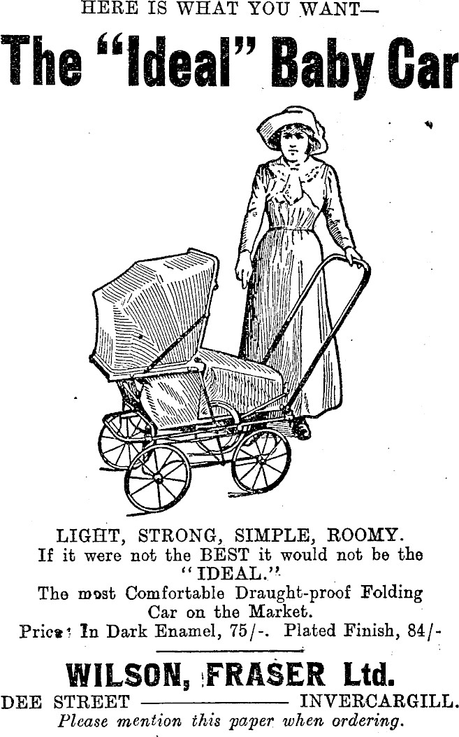 HERE IS WHAT YOU WANT The “Ideal” Baby Gar i LIGHT, STRONG, SIMPLE, ROOMY. If it were not the BEST it would not be the “ IDEAL.” - The most Comfortable Draught-proof Folding Car on the Market. Pric«l In Dark Enamel, 75/-. Plated Finish, 84/WILSON, FRASER Ltd. DEE STREET - INVERCARGILL. Please mention this paper when ordering.