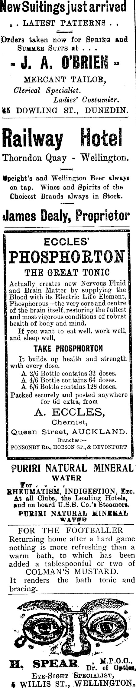 New Suitings just arrived a . LATEST PATTERNS . . Orders taken now for Spring and Summer Suits at . . .. - J. A. O’BRIEN - MERCANT TAILOR, Clerical Specialist. Ladies' Costumier. 16 DOWLING ST., DUNEDIN. Railway Hotel Thermion Quay - Wellington. Speight’s and Wellington Beer always on tap. Wines and Spirits of the Choicest Brands always in Stock. James Deaiy, Proprietor ECCLES’ PHOSPIORTON THE GREAT TONIC Actually creates new Nervous Fluid and Brain Matter by supplying the Blood with its Electric Life Element, Phosphorous— very core and centre of the brain itself, restoring the fullest and most vigorous conditions of robust health of body and mind. If you want to eat well, work well, and sleep well, TAKE PKOBPHORTOM It builds up health and strength with every dose. A 2/6 Bottle contains 32 doses. A 4/6 Bottle contains 64 doses. A 6/6 Bottle contains 128 doses. Packed securely and posted anywhere for 6d extra, from A. ECCLES, Chemist, Queen Street, AUCKLAND. Branches :— PONSONBY RD., HOBSON ST., & DEVONPORT I ill ■ml .... / PURIRI NATURAL MINERAL WATER For . * . » RHEUMATISM, INDIGESTION, Etc. At all Clubs, the Leading Hotels, and on board U.S.S. Co.’s Steamers. 9URIRI NATURAL MINERAL WATfs* FOR THE FOOTBALLER Returning home after a hard game nothing is more refreshing than a warm bath, to which has been added a tablespoonful or two of COLMAN’S MUSTARD. It renders the bath tonic and bracing. ' mm t rH.P.0.0.. SPEAR Dr. of OptiM, £ Ft>*' , M.P.0.0., Dr. of Opties* Eye-Sight Specialist, 6 WILLIS ST-i WELLINGTON^ EL SPEAR
