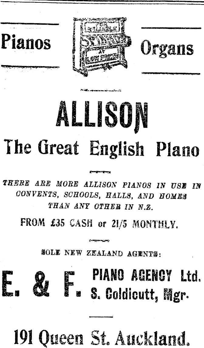 Pianos sroescH mmmMi ii Organs ALLISOfI The Great English Plano THERE ARE MORE ALLISON PIANOS IN USE IN CONVENTS, SCHOOLS, HALLS, AND HOMES THAN ANY OTHER IN N.Z. FROM £35 CASH or 21/5 MONTHLY. SOLI NEW ZEALAND AQINTS; E. & F PIANO AGENCY Ltd. PIANO AGENCY Ltd. a SM la S. Goldicutt, Mgr--191 Queen Si Auckland.