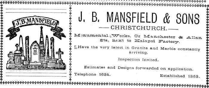 * ' * * ms M D. J. B, MANSFIELD & SONS CHRISTCHURCH. ■t- Or ‘h/S a, nclxester dc tt. | Sts., a £ xt to factory. i.Have the very latest in Granite and Marble constantly £ arriving. |i Inspection Invited. £ -iimiii Ji B, BFIELD & SONS CHRISTCHURCH. - I Mmumeatsafe-Wotka, Or Manchester <& Aliaa ®M.s set "to i,Have the vary latest in Granite and Marble constantly , arriving. * * * * * * # * ♦ Inspection Invited. Estimates and Designs forwarded on application. * Telephone 1684. Established 1863. Established 1863. Wff#W<WMWI.|.M.HWII In fTTr t.. r rTH T T JI T H J 11J »TTT TT IIJ ul