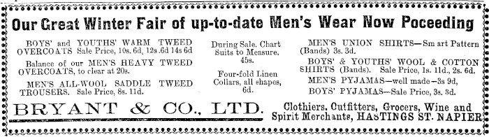 •^fffiiiflirrnwmrrrrrrriftrrrrrrrrrwrrtrrrrrrrrrrrrrrrrrrrrrtrrrwwrrrt?****** I Our Great Winter Fair of up-to-date Men’s Wear Now Poceeding $• • » 9) BOYS’ and YOUTHS’ WARM TWEED BOYS’ and YOUTHS’ WARM TWEED OVERCOATS Sale Price, 10s. 6d. 12s .6d 14s 6d Balance of our MEN’S HEAYY TWEED OVERCOATS, to clear at 20s. MEN’S ALL-WOOL SADDLE TWEED TROUSERS. Sale Price, Bs. lid. During Sale. Chart Suits to Measure. 455. Four-fold Linen Collars, all shapes, 6d. MEN’S UNION SHIRTS—Smart Pattern (Bands) Bs. 3d. BOYS’ & YOUTHS’ WOOL & COTTON SHIRTS (Bands), Sale Price, Is. lid., 2s. 6d. MEN’S PYJAMAS made—3s 9d, BOYS’ PYJAMAS— SaIe Price, 3s. 3d. BRYANT <Sc CO., LTD. Clothiers, Outfitters, Grocers, Wine and I Spirit Merchants, HASTINGS ST. NAPIER! <•