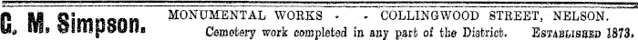 a M. Simpson. monumental works . - collingwood street, nelson. MONUMENTAL WORKS - - COLLINGWOOD STREET, NELSON. y* IHs Milll|l©Uila Cemetery work completed in any part of the District. Established 1873,