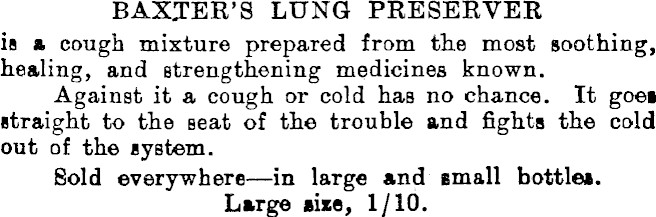 BAXTER’S LUNG PRESERVER is a cough mixture prepared from the most soothing, healing, and strengthening medicines known. Against it a cough or cold has no chance. It goes straight to the seat of the trouble and fights the cold out of the system. Sold everywherein large and small bottles. Large size, 1/10. ,