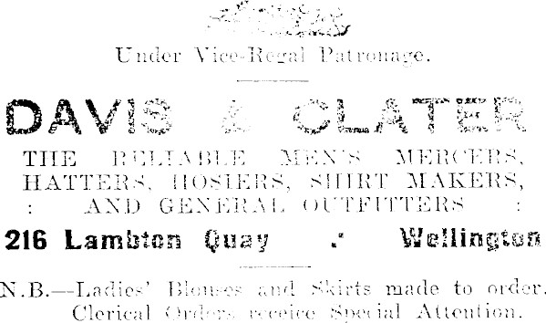 Under Vice-Regal Patronage. DAVIS & CLATER W'i THE RELIABLE MEN’S MERCERS, HATTERS, HOSIERS, SHIRT MAKERS, ; AND GENERAL OUTFITTERS : 216 Lam&tcn Quay •' Wellington N.B.—Ladies’ Blouses and Skirts made to order. Clerical Orders rcceice Special Attention.