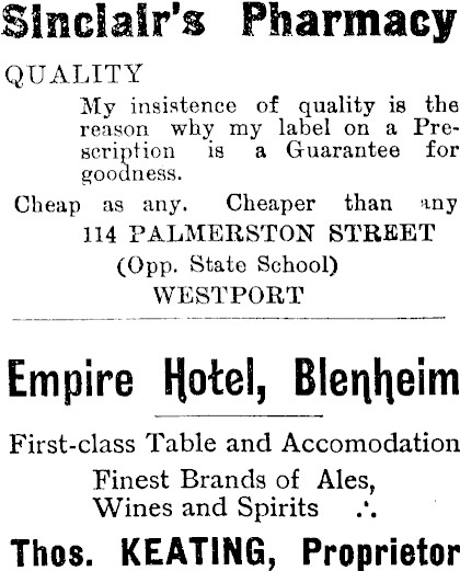 Sinclair’s Pharmacy QUALITY My insistence of quality is the reason why my label on a Prescription is a Guarantee for goodness. Cheap as any. Cheaper than any 114 PALMERSTON STREET (Opp. State School) WESTPORT Empire Hotel, Blenheim First-class Table and Accomodation Finest Brands of Ales, Wines and Spirits Thos. KEATING, Proprietor