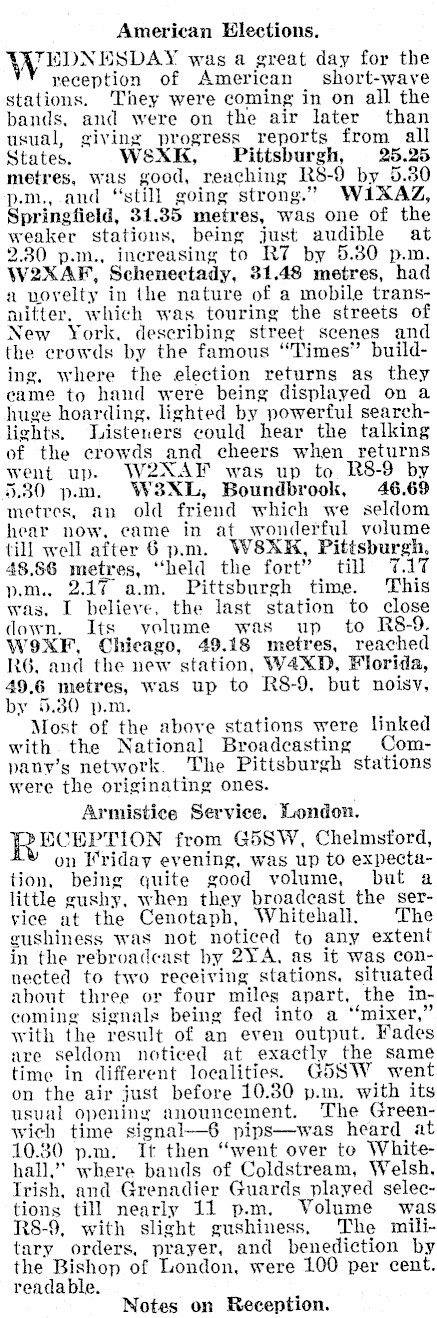 American Elections. A} TEDNESDAY was a great day for the reception of American short-wave stations. ‘They were coming in on all the bands, and were on the air later than usual, giving progress reports from all States. WSXK, = -*Pittsburgh, 25.25 metres, was good, reaching R8-9 by 5.30 p.m., and "still going strong." W1XAZ, Springfield, 31.35 metres, was one of the weaker stations, being just audible at 2.30 p.m., increasing to R7 by 5.30 p.m. W2XAF, Schenectady, 31.48 metres, had a voyelty in the nature of a mobile transmitter. which was touring the streets of New York, describing street scenes and the crowds by the famous "Times" building. where the election returns as they came to hand were being displayed on a huge hoarding. lighted by powerful searchlights. Juisteners could hear the talking of the crowds and cheers when_returns went up. W2XAF was up to R8-9 by 5.30 pm. W8XL, Boundbrook, 46.69 metres, an old friend which we seldom hear now, came in at wonderful volume till well after 6 pm. W8XK, Pittsburgh, 48.86 metres, "held the fort" till 7.17 p.m. 2.17 am, Pittsburgh time. This was, I believe, the last station to close down. Its volume was up to R8-9. W9XF, Chicago, 49.18 metres, reached RG, and the new station, W4XD, Florida, 49.6 metres, was up to R8-9, but noisv, by 5.380 p.m. Most of the above stations were linked with the National Broadcasting Company’s network. The Pittsburgh stations were the originating ones. Armistice Service. London. ECEPTION from G5SW, Chelmsford, on Iriday evening, was up to expectation, being quite good volume, but a little cushy, when they broadeast the service at the Cenotaph, Whitehall. The gushiness was not noticed to any extent in the rebroadcast by 2YA, as it was connected to two receiving stations, situated about three or four miles apart, the incoming signals being fed into a ‘‘mixer," with the result of an even output. Fades are seldom noticed at exactly the same time in different localities. GOSW went on the air just before 10.30 p.m. with its usual opening anouncement. The Greenwich time signal-6 pips-was heard at 10.30 p.m. It then "went over to Whitehall." where bands of Coldstream, Welsh. Trish, and Grenadier Guards played selections till nearly 11 p.m. Volume was RS8-9, with slight gushiness. The military orders, prayer, and benediction by the Bishop of London, were 100 per cent. readable. Notes on Reception.