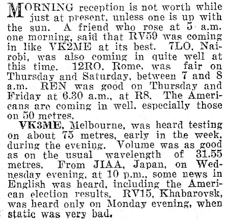 N ORNING reception is not worth while just at present, unless one is up with the sun. A friend who rose at 5: a.m. one morning, said that RV59 was coming in like VK2ME at its best. 7TLO, Nairobi, was also coming in quite well at this time. 12RO. Rome, was fair on Thursday and Saturday, between 7 and 8 a.m. REN was good on Thursday and Friday at 6.30 a. m., at R8&. The Americans are coming in well. especially those on 50 metres. VK3ME, Melbourne, was heard testing on about 75 metres, early in the week, during the evening. Volume was as good as on the usual wavelength of 31.55 metres. J'rom JIAA, Japan, on Wednesday evening, at 10 p.m., some news in English was heard, including the Ameriean election results, RV15, Khabaroysk, was heard only on Monday evening, when static was yery bad.