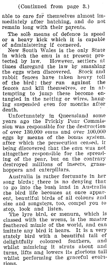(Continued from page 3.) able to care for themselves almost immediately after hatching, and do not remain long with their parents. The solé means of defence is speed or a heavy kick which it is capable of administering if cornered. ~ New South Wales is the only State in which the emu is at present protected by law. However, settlers at times disregard the law by smashing the eggs when discovered. Stock and rabbit fences have taken heavy toll of the bird; they run against the fences and kill themselves, or in attempting to jump these become entangled in the netting or wires, hanging suspended even for months after death. Unfortunately in Queensland some years ago the Prickly Pear Commission was responsible for the destruction of over 130,000 emus and over 100,000 eggs by means of the bonus system. after which the persecution ceased, it being discovered that the emu was not altogether responsible for the spreading of the pear, but on the contrary destroyed millions of insects, grasshoppers and caterpillars. Australia is rather fortunate in her song birds; there is no denying that to go into the bush land in Australia the bird life becomes at once apparent, beautiful birds of all colours and size and songsters, too, compel you to stop, look and listen. The lyre bird, or menura, which is classed with the wrens, is the master feathered mimic of the world, and can imitate any bird it hears. It is a very stately bird with a beautiful tail of delightfully coloured feathers, and whilst mimicing it struts about and turns, lifts and lowers its glorious tail whilst performing the graceful evolntions.