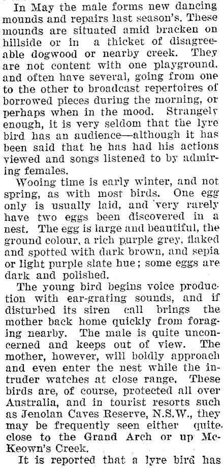 In May the male forms new dancing mounds and repairs last season’s, These mounds are situated amid bracken on hillside or in a thicket of disagreeable dogwood or nearby creek. They are not content with one playground, and often have several, going from one to the other to broadcast repertoires of borrowed pieces during the morning, or perhaps when in the mood. Strangely enough, it is very seldom that the lyre bird has an audience-although it has been said that he has had his actions viewed and songs listened to by adimiring females. Wooing time is early winter, and not spring, as with most birds. One eg¢ only is usually laid, and ‘very rarely have two eggs been discovered in a nest. The egg is large and beautiful, the ground colour, a rich purple grey, flaked and spotted with dark brown, and sepia or light purple slate hue; some eggs are dark and polished. The young bird begins voice production with ear-grating sounds, and if disturbed its siren call brings the mother back home quickly from foraging nearby. The male is quite unconcerned and keeps out of view. The mother, however, will boldly approach and even enter the nest while the intruder watches at close range, These birds are, of course, protected all over Australia, and in tourist resorts such as Jenolan Caves Reserve, N.S.W., they may be frequently seen either quite. close to the Grand Arch or up McKeown’s Creek, It is reported that a lyre bird has