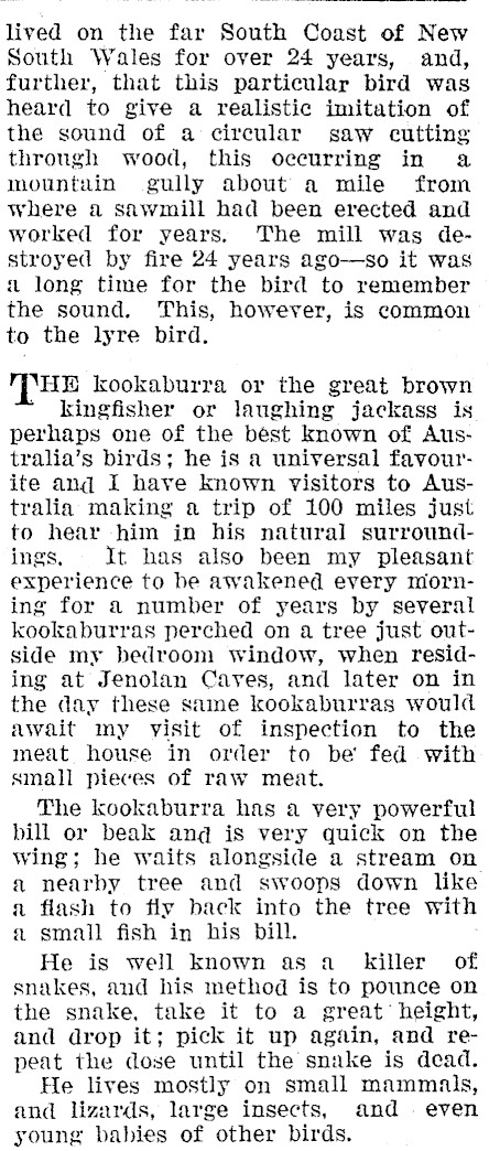 lived on the far South Coast of New South Wales for over 24 years, and, further, that this particular bird was heard to give a realistic imitation of the sound of a circular saw cutting through wood, this occurring in a mountain gully about a mile from where a sawmill had been erected and worked for years. The mill was destroyed by fire 24 years ago-so it was i long time for the bird to remember the sound. This, however, is common to the lyre bird. "THE kookaburra or the great brown kingfisher or laughing jackass is perhaps one of the best known of Australia’s birds; he is a universal favourite and I have known visitors to Australia making a trip of 100 miles just to hear him jin his natural surroundings. It has also been my pleasant experience to be awakened every morning for a number of years by several kookaburras perched on a tree just outside my bedroom window, when residing at Jenolan Caves, and later on in the day these same kookaburras would await my visit of inspection to the meat house in order to be’ fed with small pieces of raw meat. The kookaburra has a very powerful bill or beak and is very quick on the wing; he waits alongside a stream on a nearby tree and swoops down like a flash to fly back into the tree with a small fish in his bill. He is well known as a_ killer of snakes, and his method is to pounce on the snake, take it to a great’ height, and drop it; pick it up again, and repeat the dose until the snake is dead. He lives mostly on small mammals, and lizards, large insects, and . even young babies of other birds.
