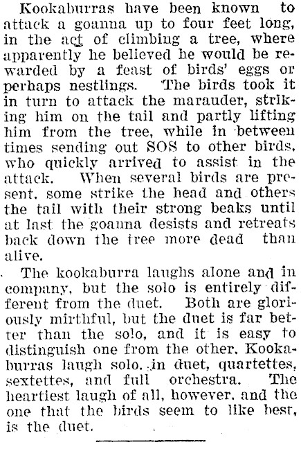 Kookaburras have been known to attack a goanna up to four feet long, in the act of climbing a tree, where apparently he believed he would be rewarded by a feast of birds’ eggs or perhaps nestlings. ‘The birds. took it in turn to attack the marauder, striking him on the tail and partly lifting him from the tree, while in ‘between times sending out SOS to other birds, who quickly arrived to assist in the attack. When several birds are present. some strike the head and others the tail with their strong beaks until at last the goanna desists and retreats back down the tree more dead than alive. The kookaburra laughs alone and in company, but the solo is entirely: different from the duet. Both are gloriously mirthful, but the duet is far better than the solo, and it is easy to distinguish one from the other, Kookaburras laugh solo..in duet, quartettes, sextettes, and full orchestra. The heartiest laugh of all, however, and the one that the birds seem to like best, is the duet. .