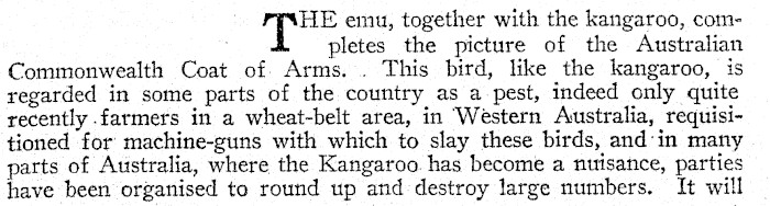 HE emu, together with the kangaroo, completes the picture of the Australian Commonwealth Coat of Arms. . This bird, like the kangaroo, is regarded in some parts of the country as a pest, indeed only quite recently .farmers in a wheat-belt area, in ‘Western Australia, requisitioned for machine-guns with which to slay these birds, and:in many parts of Australia, where the Kangaroo. has become a nuisance, parties have been organised to round up and destroy large numbers. It will