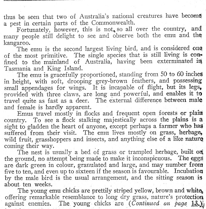 thus be seen that two of Australia’s national creatures have becomé a pest in certain parts of the Commonwealth. Fortunately, however, this is not,so all over the country, and many people still delight to see and observe both the emu and the kangaroo. The emu is the second largest living bird, and is considered ong of the most primitive. The single species that is still living is con« fined to the mainland of Australia, having been exterminated iq Tasmania and King Island. The emu is gracefully proportioned, standing from 50 to 60 inches in height, with soft, drooping grey-brown feathers, and possessing small appendages for wings. It is incapable of flight, but its legs, provided with three claws, are long and powerful, and enables it to travel quite as fast as a deer. The external difference between male and female is hardly apparent. Emus travel mostly in flocks and frequent open forests or plaiti country. To see a flock stalking majestically across the plains is a sight to gladden the heart of anyone, except perhaps a farmer who has suffered from their visit. The emu lives mostly on grass, herbage, wild fruit, grasshoppers and irisects, and anything else of a like nature coming their way. The nest is usually a bed of grass or trampled herbage, built of the ground, no attempt being made to make it inconspicuous. The eggs are dark green in colour, granulated and large, and may number from five to ten, and even up to sixteen if the season is favourable. Incubation by the male bird is the usual arrangement, and the sitting season ‘is about. ten weeks. , The young emu chicks are prettily striped yellow, brown and white, offering remarkable resemblance to long dry grass, nature’s protection against enemies. The. young. chicks are (Continued. on page 13.))