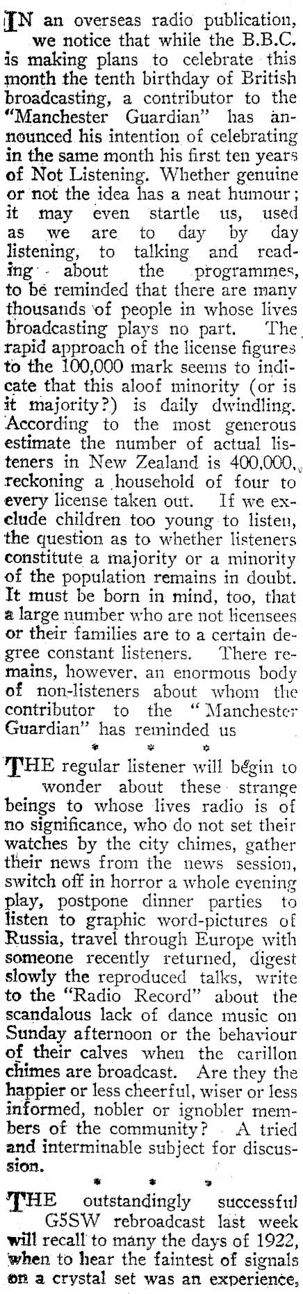 i[N an overseas radio publication, we notice that while the B.B.C. is making plans to celebrate this month the tenth birthday of British broadcasting, a contributor to the "Manchester Guardian" has announced his intention of celebrating in the same month his first ten years of Not Listening. Whether genuine or not the idea has a neat humour; it may even startle us, used as we are to day by day listening, to talking and reading’- about the programmes, to bé reminded that there are many thousands ‘of people in whose lives broadcasting plays no part. The. tapid approach of the license figures to the 100,000 mark seems to indicate that this aloof minority (or is it majority?) is daily dwindling. According to the most generous estimate the number of actual listeners in New Zealand is 400,000,, reckoning a household of four to every license taken out. If we exelude children too young to listen, the question as to whether listeners constitute a majority or a minority of the population remains in doubt. It must be born in mind, too, that a large number who are not licensees or their families are to a certain de- gree constant listeners. There remains, however, an enormous body of non-listeners about whom the contributor to the ‘ Manchester Guardian" has reminded us * um % THE regular listener will bégin to wonder about these: strange beings to whose lives radio is of no significance, who do not set their watches by the city chimes, gather their news from the news session, switch off in horror a whole evening play, postpone dinner parties to listen to graphic word-pictures of Russia, travel through Europe with someone recently returned, digest slowly the reproduced talks, write to the "Radio Record" about the scandalous lack of dance music on Sunday afternoon or the behaviour of their calves when the carillon chimes are broadcast. Are they the happier or less cheerful, wiser or less informed, nobler or ignobler members of the community? A tried and interminable subject for discussion. s * s JHE outstandingly successful G5SW rebroadcast last week will recall’ to many the days of 1922, when to hear the faintest of signals of a crystal set was an experience,