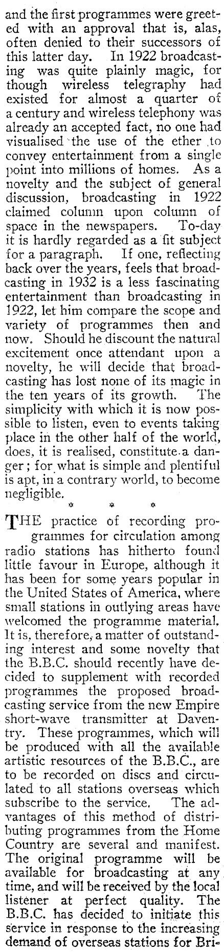 and the first programmes were greeted with an approval that is, alas, often denied to their successors of this latter day. In 1922 broadcasting was quite plainly magic, for though wireless telegraphy had existed for almost a quarter of acentury and wireless telephony was already an accepted fact, no one had visualised ‘the use of the ether to convey entertainment from a single point into millions of homes. Asa novelty and the subject of general discussion, broadcasting in 1922 claimed column upon column of space in the newspapers. To-day it is hardly regarded as a fit subject fora paragraph. If one, reflecting back over the years, feels that broadcasting in 1932 is a less fascinating entertainment than broadcasting in 1922, let him compare the scope and variety of programmes then and now. Should he discount the natural excitement once attendant upon a novelty, he will decide that broadcasting has lost none of its magic in the ten years of its growth. The simplicity with which it is now possible to listen, even to events taking place in the other half of the world, does, it is realised, constitute.a danger; for what is simple and plentiful is apt, in a contrary world, to become negligible. % ~ x THE practice of recording programmes for circulation among radio stations has hitherto found little favour in Europe, although it has been for some years popular in the United States of America, where small stations in outlying areas have welcomed the programme material, It is, therefore, a matter of outstanding interest and some novelty that the B.B.C. should recently have decided to supplement with recorded programmes the proposed broadcasting service from the new Empire short-wave transmitter at Daventry. These programmes, which will be produced with all the available artistic resources of the B.B.C., are to be recorded on discs and circulated to all stations overseas which subscribe to the service, The advantages of this method of distributing programmes from the Home Country are several and manifest. The original programme will be available for broadcasting at any. time, ard will be received by the local listener at perfect quality. The B.B.C. has decided to initiate this service in response to the increasing demand of overseas stations for Bri-