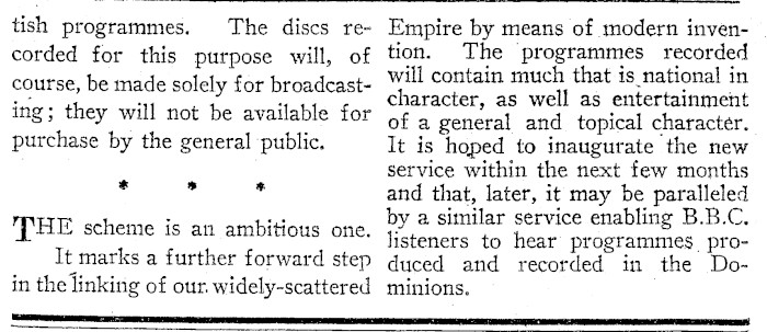 tish programmes. The discs recorded for this purpose will, of course, be made solely for broadcasting; they will not be available for purchase by the general ‘public. * *s + "THE scheme is an ambitious one. It marks a further forward step in the linking of our. widely-scattered Empire by means of modern invention. The programmes recorded will contain much that is national in character, as well as entertainment of a general and topical character. It is hoped to inaugurate the new service within the next few months and that, later, it may be paralleled by a similar service enabling B.B.C, listeners to hear programmes produced and recorded in the Dominions.