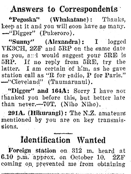 Answers to Correspondents ° "Pegoska"’ (Whakatane): Thanks, keep at it and you will soon have as many. -"Digger" (Pukeroro). "Sumy" (Alexandra): I logged VK3CH, 2ZF and 5RP on the came date as you, az‘ would suggest your SRB is BRP. If no reply from BRE, try the latter. I am certain of him, as he gave station call as "R for radio, P for Paris." -‘Cleveland" (Taumarunti). _- "Digger" and 164A: Sorry I have not thanked you before this, but better late than never--T70T, (Niho Niho), 201A. (Hikurangi): The N:Z. amateurs mentioned by you are on key tratismissions, Identification Wanted Foreign station on. 312 m. heard at 6.10 p.m. ‘approx. on October 10, 2ZF — coming on prevented me from obtaining