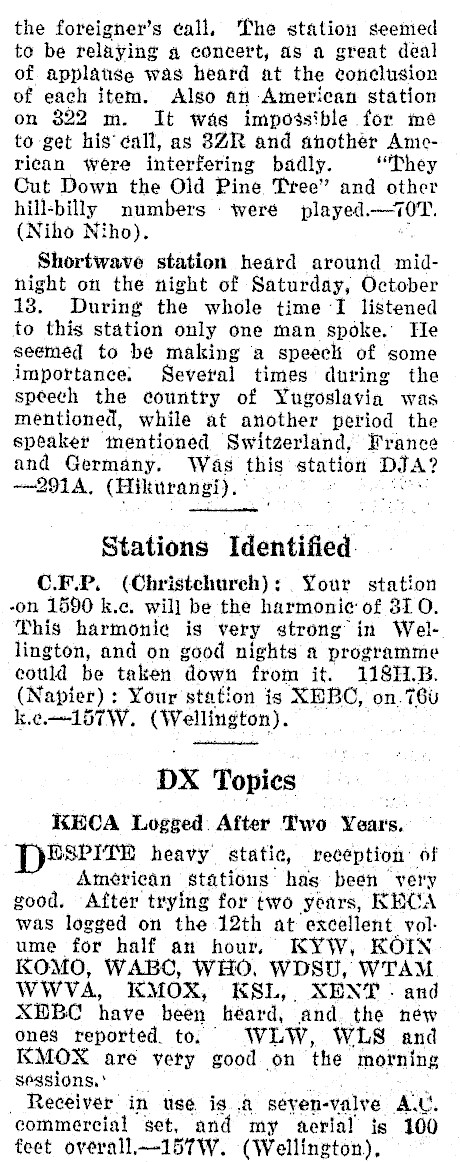 the foreigner’s ¢all, The station seemed to be relaying a concert, as a great deal of applause was heard at the conclusion of each item. Also an American station on 322 m. It was impossible for mé to get his’ ¢all, as 8ZR and anothér American were interfering badly. "Phey Cut Down the Old Pine Tree" and other hill-billy numbers were played. -*0T. (Niho Niho). Shortwave station heard around midnight on the night of Saturday, October 13. During the whole time I listened to this station only one man spoke. Te seemed to be making a speech of some importance. Several times during the speech the country of Yugoslavia was mentioned, while at another period the speaker ‘mentioned Switzerland, France and Germany. Was this station DJA? ~-~291A, (Hikurangi). ° Stations Identified. C.F.P. (Christchurch): Your station -on 1590 k.c. will be the harmonic¢ of 310. This harmonic is very strong in Wellington, and on good nights a programme could be taken down from it. 118H.B. (Napier) : Your station is XEBC, on. 76u k.e.-157W. (Wellington). DX Topics KECA Logged: After Two Years, D*sritz heavy’ static, reception: of Américan stations has been | very good. After trying for two years, EECA was logged on the at excellent volume for half an hour. KYW, KOIN KOMO, WABC, WHO, WDSU, WTAM WWVA, KMOX, KSL,. XENT and XEBC have heen héard, and. the new ones reported. to. WLW, WLS and KMOX are yery good on the morning sessions, * _ Receiver in use is A seven-valve AK. commercial set, and my aerial is 100 feet overall-157W. (Wellington),