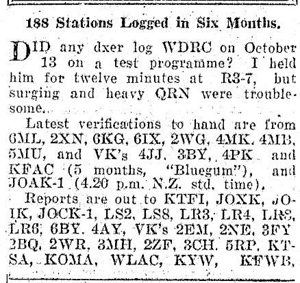 188 Stations Logged in Six Months, piP any dxer log WDRO© on October 13 on a test programme? I held him for twelve minutes at R38-7, but surging and heavy QRN were "trouble: some,, Latest verifications to ‘hand are from GML, 2XN, 6IKEG, 61X, 2a, 4MK. 4M1, 5MU, and VK’s 45J. 8BY,, 4PK. and KPAC ‘(5 months, "Bluegum"), and JOAK-1 (4.20 p.m..N.Z. std. time), ‘ Reports, are out.to KTFI, JOXK, JoIK, JOCK-1, LS2, LS8, LR4, LES, LRG; 6BY. 4AY, VK’s 22M, ONT, BY 2BQ, 2WR, 8MH, 2ZF, 8CH. 5RP, KTSA, KOMA, WLAC, KYW, KFWB,