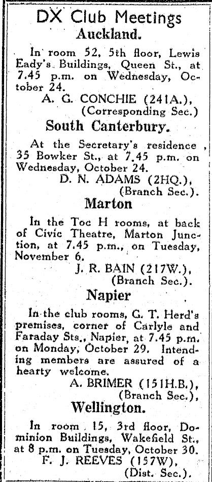 DX Club Meetings ' * Auckland. In‘ room 52, 5th floor, Lewis Eady’s. Buildings, Queen St., at "7.45 p.m. on Wednesday, October 24. : A. G. CONCHIE (241A.,), (Corresponding Sec.) South Canterbury. At the Secretary's residence 35 Bowker St., at 7.45 p.m. on Wednesday, October 24. ' D. N. ADAMS (2HQ.), (Branch Sec.). Marton In the Toe H rooms, at back of Civic Theatre, Marton Junction, at 7.45 p.m., on Tueeday, November 6, J. R. BAIN (217W.), (Branch Sec.). Napier In-the club rooms, G. T. Herd's premises, cornet of Carlyle and Faraday Sts,, Napier, at.7.45 p.m. on Monday; October 29, Intend ing members are assured of a heatty welcome. A. BRIMER (151H.B.), _ (Branch Sec.), In room. 15, 3rd floor, Dotinion Buildings, Wakefield St, ; at 8 p.m. on Tuesday, October 30. F. J. REEVES (157W), (Dist. Sec).