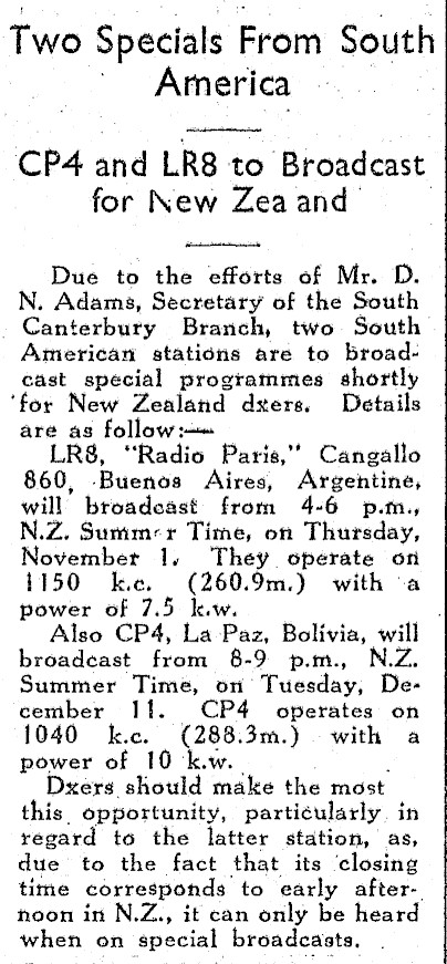 Two Specials From South America CP4 and LR8 to Broadcast for New Zea and Due to the efforts of Mr. D. N. Adama, Secretary of the South Canterbury Branch, two South American stations are to broadcast special programmes shortly ‘for New Zealand dxers, Details aré as follow :-= LR8&, "Radio Paris,’ Cangallo 860, -Buenos Aires, Argentine, will’ broadeast from 4-6 p.m., N.Z. Summer Time, on Thursday, Novembet 1, They operate on 1150 ke. (260.9m.) with "a power of 7.5 kw. Also CP4, La Paz, Bolivia, will broadeast from 8-9 p.m., Summer Time, on Tuesday, December 11. CP4 operates on 1040 kc. (288.3m.) with a power of 10 kw. Dxers should make the mast this opportunity, particularly. in regard to the latter station, as, due to the fact that its ‘closing time corresponds: to early after-. hoon in N.Z., it can only be heard when on special broadcasts. .