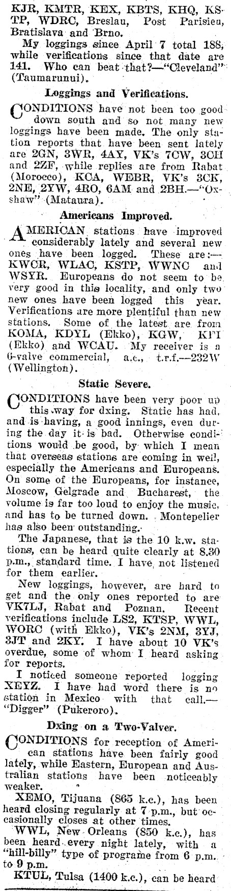 KJR, KMTR, KEX, KBTS, KHQ, KSTP, WDRC, Breslau, Post Parisien, Bratislava: and ‘Brno, My loggings since April’ 7 total 188, while verifications since that date are 141. Who can beat that?-"Cleyeland’"": (Taumarunui), ; Loggings and Verifications. (CONDITIONS have not been too good down south and so not many new loggings have been made, The only station reports that. have been sent lately are 2GN, 3WR, 4AY, VK’s 7CW, 30I! and 229, while replies are from Rabat (Morocco), KOA, WEBR, VK’s 38CK, 2NH, 2YW, 4RO, 6AM and 2BH.-*Ox- . shaw" (Mataura). , Americans Improved. AMERICAN, stations have -improved ‘""™ considerably lately and several new ones have been logged. ‘These are:KWCR, WLAC, KSTP, WWNC anil WSYR.. Europeans do not seem to be. very good in this locality, and only two new ones have been logged this year. Verifications are more plentiful than new stations. Some of the latest. are from KOMA, KDYL (Ekko), KGW, KYI (Ekko) and WCAU. ."My receiver is a G-valve commercial, a.c., t.r.f.-232W (Wellington). . Statice Severe. ONDITIONS have been yery poor upd this .way for dxing. Static has had, and is having, a good innings, even during the day it:is bad. Otherwise condi-' tions would .be good, by: which I mean that overseas stations are coming in weil, especially the Americans and Europeans. On some of the Europeans, for instance, Moseow, Gelgrade and Bucharest, the volume is far too loud to enjoy the music, and has to be turned down. . Montepelier has also been outstanding. — The Japanese, that is the 10 k.w. stations, can be heard quite clearly at 8.80 p-m., standard time. I have, not listened for them earlier, New loggings, however, are hard to get and the only ones reported to are VK7LJ, Rabat and Poznan. Recent verifications include LS2, KTSP, WWL, WORC (with Ekko), VK’s 2NM, 38YJ, 3JT and 2KY. I have about 10 VK’s overdue, some of whom’ I heard asking for reports. I noticed someone reported logging XEYZ. I have had word there is no station in Mexico. with that call."Digger" (Pukeroro). Dxing on a Two-Valver. (CONDITIONS for reception of Ameriean stations have been fairly good lately, while Eastern, European and Australian stations have been noticeably weaker. ° XEMO, Tijuana (865 k.c.), has been heard closing regularly at 7-p.m., but’ occasionally closes at other times. ‘WWL, New- Orleans (850 k.c.), has been heard..every night lately, with a "hill-billy" type of programe from 6 p.m.. to 9 p.m. " .. KTUL, Tulsa (1400 k.c.), can be heard