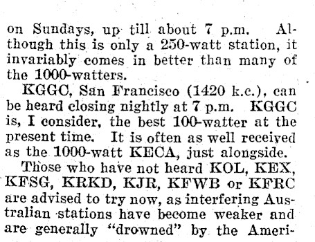 on Sundays, up: till about 7 p.m. Although this is only a station, it invariably comes in better than many of the 1000-watters. . KGGO, San Francisco (1420 k.c.), can be heard closing nightly at 7 p.m. KGGC is, I consider, the best 100-watter at the present time. It is often as well receiyed as the 1000-watt KECA, just alongside. Those who have not heard KOL, KEX, KESG, KRKD, KJR, KFWB or "*KFRC are advised to try now, as interfering Australian ‘stations have become weaker and are generally "drowned" by. the Ameri-