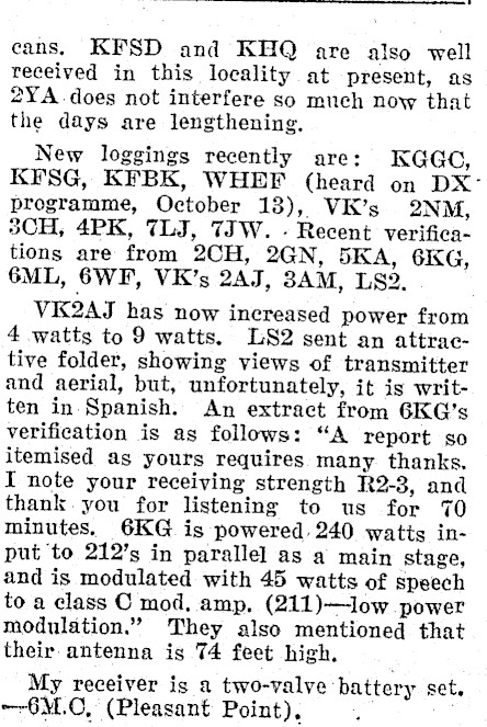 cans. KFSD and KHQ are also well received in this locality at present, as 2YA does not interfere so much now that the days are lengthening. New loggings recently are: KGGO, KFSG, KFBK, WHEF (heard on DXprogramme, October 13), VK’s 2NM, 3CH, 4PK, TLJ, TIW. Recent verifications are from 2CH, 2GN, 5KA, 6KG, 6ML, 6WF, VK’s 2AJ, 3AM, LS2. VK2AJ has now increased power from 4 watts to 9 watts. LS2 sent an attractive folder, showing views of transmitter and aerial, but, unfortunately, it is written in Spanish. An extract from 6KG’s verification is as follows: "A report so itemised as yours requires many thanks. I note your receiving strength R2-3, and thank. you for listening to us for 70 minutes. 6KG is powered 240 watts input ‘to 212’s in parallel as a main stage, and is modulated with 45 watts of speech to a class C mod, amp, (211)-low power modulation." They also mentioned that their. antenna is 74 feet high. My receiver is a two-valve battery set, ~-6M.0, (Pleasant Point),