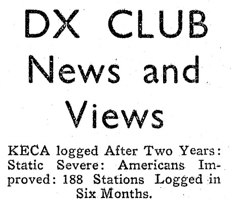 DX CLUB News and Views KECA logged After Two Years: Static Severe: Americans Improved: 188 Stations Logged in Six Months. —