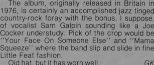 The album, originally released in Britain in 1976, is certainly an accomplished jazz tinged country-rock foray with the bonus, I suppose, of vocalist Sam Galpin sounding like a Joe Cocker understudy. Pick of the crop would be "Your Face On Someone Else” and "Mama Squeeze” where the band slip and slide in fine Little Feat fashion. Old hat, but it has worn well. GK