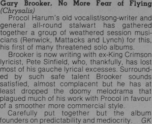 Gary Brooker, No More Fear of Flying (Chrysalis) Procol Harum's old vocalist/song-writer and general all-round stalwart has gathered together a group of weathered session musicians (Renwick, Mattacks and Lynch) for this, his first of many threatened solo albums. Brooker is now writing with ex-King Crimson lyricist, Pete Sinfield, who, thankfully, has lost most of his gauche lyrical excesses. Surrounded by such safe talent Brooker sounds satisfied, almost complacent but he has at least dropped the doomy melodrama that plagued much of his work with Procol in favour of a smoother more commercial style. Carefully put together but the album founders on predictability and mediocrity. GK