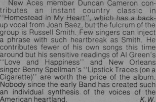 New Aces member Duncan Cameron contributes an instant country classic in “Homestead in My Heart”, which has a backup vocal from Joan Baez, but the fulcrum of the group is Russell Smith. Few singers can inject a phrase with such heartbreak as Smith. He contributes fewer of his own songs this time around but his sensitive readings of Al Green’s “Love and Happiness” and New Orleans singer Benny Spellman’s "Lipstick Traces (on a Cigarette)" are worth the price of the album. Nobody since the early Band has created such an individual synthesis of the voices of the American heartland. K. W.