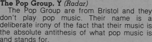 The Pop Group, Y (Radar) The Pop Group are from Bristol and they don’t play pop music. Their name is a deliberate irony of the fact that their music is the absolute antithesis of what pop music is and stands for.