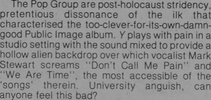 The Pop Group are post-holocaust stridency, pretentious dissonance of the ilk that characterised the too-clever-for-its-own-damn-good Public Image album. Y plays with pain in a studio setting with the sound mixed to provide a hollow alien backdrop over which vocalist Mark Stewart screams "Don’t Call Me Pain” and “We Are Time”, the most accessible of the 'songs’ therein. University anguish, can anyone feel this bad?