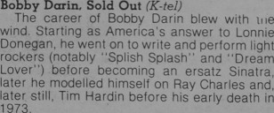 Bobby Darin, Sold Out (K-tel) The career of Bobby Darin blew with me wind. Starting as America's answer to Lonnie Donegan, he went on to write and perform light rockers (notably “Splish Splash” and "Dream Lover”) before becoming an ersatz Sinatra, later he modelled himself on Ray Charles and, later still, Tim Hardin before his early death in 1973.