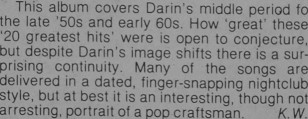 This album covers Darin's middle period fo the late ’sos and early 60s. How ‘great’ these ‘2O greatest hits’ were is open to conjecture, but despite Darin's image shifts there is a surprising continuity. Many of the songs are delivered in a dated, finger-snapping nightclub style, but at best it is an interesting, though not arresting, portrait of a pop craftsman. K. W.