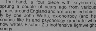 The band, a four piece with keyboards, sprung a couple of years ago from various places around England and are propelled chiefly by one John Watts, ex-choirboy (and he sounds like it) and psychology graduate who now writes Fischer-Z’s inoffensive lightweight songs.
