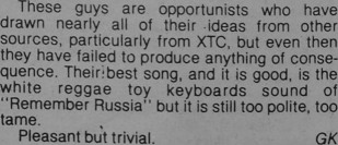 These guys are opportunists who have drawn nearly all of their ideas from other sources, particularly from XTC, but even then they have failed to produce anything of consequence. Their;best song, and it is good, is the white reggae toy keyboards sound of "Remember Russia” but it is still too polite, too tame. Pleasant but trivial. GK