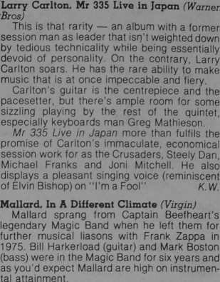 Larry Carlton. Mr 335 Live in Japan (Warner Bros) This is that rarity an album with a former session man as leader that isn’t weighted down by tedious technicality while being essentially devoid of personality. On the contrary, Larry Carlton soars. He has the rare ability to make music that is at once impeccable and fiery. Carlton's guitar is the centrepiece and the pacesetter, but there’s ample room for some sizzling playing by the rest of the quintet, especially keyboards man Greg Mathieson. Mr 335 Live in Japan more than fulfils the promise of Carlton’s immaculate, economical session work for as the Crusaders, Steely Dan, Michael Franks and Joni Mitchell. He also displays a pleasant singing voice (reminiscent of Elvin Bishop) on "I'm a Fool” K. W. Mallard, In A Different Climate (Virgin) Mallard sprang from Captain Beefheart’s legendary Magic Band when he left them for further musical liasons with Frank Zappa in 1975. Bill Harkerload (guitar) and Mark Boston (bass) were in the Magic Band for six years and as you’d expect Mallard are high on instrumental attainment.