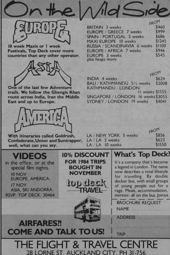 Or\ |/\A* €> BRITAIN 3 weeks EUROPE / GREECE 7 weeks SPAIN / PORTUGAL 5 weeks MAXI EUROPE 10 weeks FROM $460 $999 $686 $1245 10 week Maxis or I week Festivals, Top Deck cover more countries than any other operator. One of the last few Adventure trails. We follow the Ghengis Khan route across India, Iran the Middle East and up to Europe. > BRITAIN'3 weeks -$460 EUROPE /GREECE 7 weeks i;'^s999 SPAIN / PORTUGAL; 5 weeks $686 MAXI EUROPE 10 weeks:. $1245 RUSSIA / SCANDINAVIA 6 weeks $llOO EUROPE/AFRICA 7 weeks -^5946 EUROPE 3 weeks $545 plus heaps more INDIA 4 weeks $624 BALI / KATHMANDU SVi weeks S2OOB KATHMANDU/ LONDON ; II weeks $1555 SINGAPORE / LONDON 16 weeks $3055 SYDNEY/LONDON 19 weeks $4041 Imfll'l'iM <lilllJHH^'**' L *"* *** 111iBllDfif ■ •■■■■ With itineraries called Goldrush, LAV NEW YORK 5 weeks Confederate,Union and Suntrapper, -LA /LA 3 weeks well, what can you say. LA /LA 10 weeks LA / NEW YORK 5 weeks LA / LA 3 weeks LA /LA 10 weeks f*' $856 $623 $1550 VIDEOS in the office, or at the special film \ nights. 10 NOV- . EUROPE, AMERICA. 17 NOV ASIA, SKI ANDORRA. RSVP. TOP DECK. 30464. j 10% DISCOUNT FOR 1984 TRIPS BOUGHT IN NOVEMBER Whafs Top Deck? It's a company that's become a legend in London. The name now describes a total lifestyle for travelling. By double decker bus, with small groups of young people out for a —^TRAVEt^ rage. Meals, accommodation, ■stereos L-all on the bus. Join jus. ..... : ■'■ ■ .. ..; PW Wnri% What's Top Deck? It's a company that's become a legend in London. The name now describes a total lifestyle for travelling. By double decker bus, with small groups of young people out for a rage. Meals, accommodation, stereos 1 - all on the bus. Joinjus. BROCHURE REQUEST NAME AIRFARES?! ADDRE COME AND TALK TO US! ADDRESS TRIP THE FLIGHT & TRAVEL CENTRE 28 LORNE ST. AUCKLAND CITY. PH 31-756 QpacoDaaaooaDnaoaaoDoa 'nnaaaaaDßoon